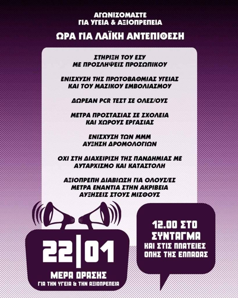 Μπροστά σε αυτήν την κατάσταση, είναι αναγκαίο να υπάρξει άμεση κλιμάκωση του αγώνα από την πλευρά των εργαζομένων. Τόσο η τωρινή, όσο και όλες οι προηγούμενες κυβερνήσεις έχουν ευθύνη για την διάλυση του ΕΣΥ και την κοινωνική κατάρρευση. Αντί μπροστά στην πανδημία να ενισχυθεί η δημόσια υγεία και να παρθούν μέτρα προστασίας για το λαό, η κυβέρνηση αντιμετωπίζει την πανδημία με αυταρχισμό, καταστολή και απολύσεις. Βάζει διαρκώς στο στόχαστρο τον συνδικαλισμό, τις διαδηλώσεις, το πανεπιστημιακό άσυλο, κ.α. Με το συντονισμό σωματείων και συλλογικοτήτων σε αγωνιστική κατεύθυνση, να ηττηθούν τα σχέδια της Κυβέρνησης.