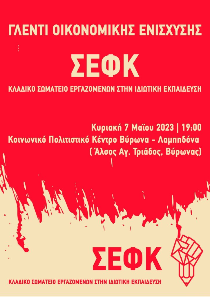 Ο ΣΕΦΚ-Κλαδικό Σωματείο Εργαζομένων στην Ιδιωτική Εκπαίδευση διοργανώνει γλέντι οικονομικής ενίσχυσης με live μουσική την Κυριακή 7 Μάη από τις 19:00 στο Κοινωνικό Πολιτιστικό Κέντρο Βύρωνα- Λαμπηδόνα (Άλσος Αγ. Τριάδος, Βύρωνας)