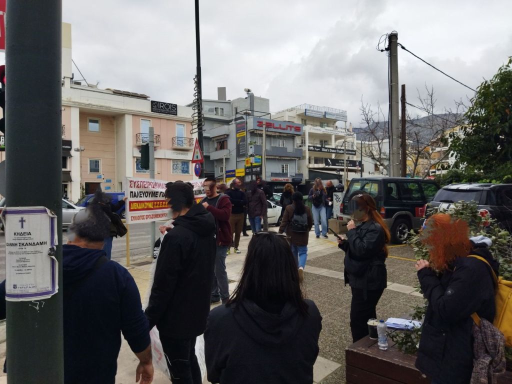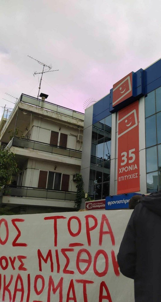 Μετά το τέλος της πορείας, μεταβήκαμε στα κεντρικά γραφεία του Ομίλου Πουκαμισάς, στην Αργυρούπολη, όπου πραγματοποιήσαμε συγκέντρωση έξω από αυτά. Ζητήσαμε να συναντηθούμε με τον πρόεδρο του Ομίλου κ. Πουκαμισά ή τον αντιπρόεδρο κ. Χατζητέγα, αλλά παρότι βρίσκονταν εκεί, δεν διέθεσαν ένα δεκάλεπτο για να δουν τους εκπροσώπους των εργαζομένων, προφασιζόμενοι φόρτο εργασίας ή, στη συνέχεια, παρότρυνση να απευθυνθούμε στον σύλλογο των εργοδοτών. Άλλωστε, καμία ανταπόκριση δεν υπήρξε και σε προηγούμενα επίσημα αιτήματα των σωματείων για συνάντηση με τη διοίκηση του Ομίλου. Ο κ. Πουκαμισάς, προφανώς νομίζοντας ότι θα μας τρομάξει, κάλεσε την αστυνομία και ήρθε στη συγκέντρωση -μάλιστα, υψηλόβαθμο στέλεχος της αστυνομίας.