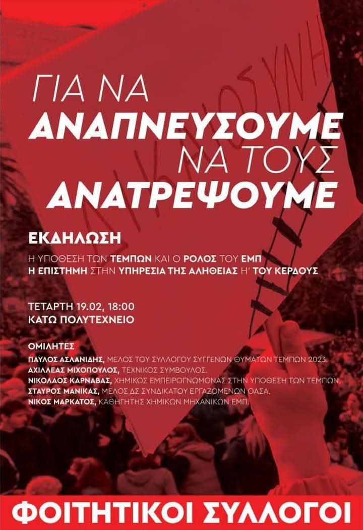 Την Τετάρτη 19/02 είναι προγραμματισμένη εκδήλωση Φοιτητικών Συλλόγων για το έγκλημα των Τεμπών από κοινού με εμπειρογνώμονες, πανεπιστημιακούς, μέλη του Συλλόγου Συγγενών Θυμάτων Τεμπών 2023 και εργαζόμενους στις συγκοινωνίες, στον χώρο του Κάτω Πολυτεχνείου.