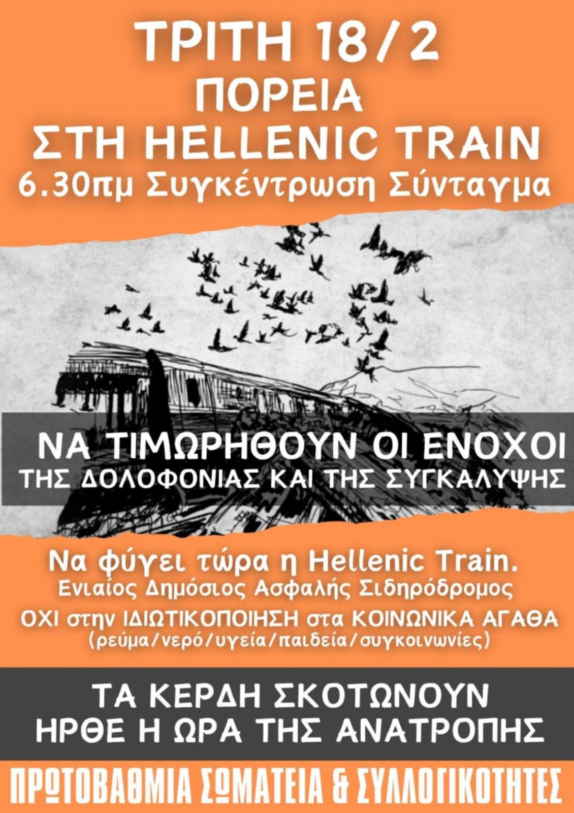 Στηρίζουμε το συλλαλητήριο σήμερα Τρίτη 18/2 6.30μμ στο Σύνταγμα και πορεία στη Hellenic Train προβάλλοντας το πάνδημο αίτημα για την διακοπή εδώ και τώρα της σύμβασης, χωρίς αποζημίωση, για να εθνικοποιηθεί – κρατικοποιηθεί ο σιδηρόδρομος, για ενιαίο, αποκλειστικά δημόσιο σιδηρόδρομο για να είναι ασφαλής και φτηνός για το λαό κόντρα στο κέρδος.