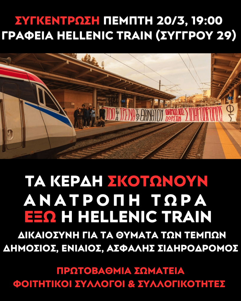 Έξω ΤΩΡΑ η HELLENIC TRAIN. Τα κέρδη σκοτώνουν. Να επιστρέψει ο σιδηρόδρομος χωρίς αποζημίωση στο δημόσιο,ενάντια στην απελευθέρωση των αγορών της ΕΕ και το κέρδος. Για ενιαίο, αποκλειστικά δημόσιο σιδηρόδρομο, με τον έλεγχο των εργαζόμενων. Κόντρα στα ιδιωτικοοικονομικά κριτήρια κριτήρια, για να είναι ασφαλής, σύγχρονος, φτηνός για το λαό.