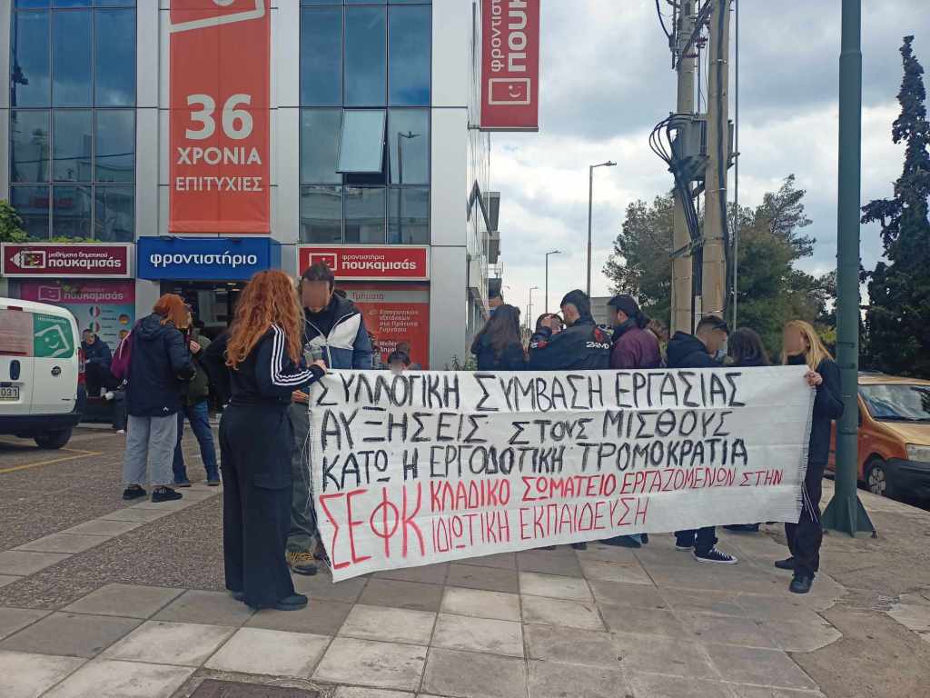 Ο ΣΕΦΚ-Κλαδικό Σωματείο Εργαζομένων στην Ιδιωτική Εκπαίδευση μετά τις απεργιακές κινητοποιήσεις της Τετάρτης 9 Απρίλη πραγματοποίησε παρέμβαση στα κεντρικά του ομίλου Πουκαμισά στην Αργυρούπολη. Δεκάδες μέλη του σωματείου βρεθήκαμε εκεί για να διαμαρτυρηθούμε για τις συνθήκες που επικρατούν σε πληθώρα παραρτημάτων του ομίλου. Από πλευράς μας απαιτήσαμε συνάντηση με τη διοίκηση του Πουκαμισά, για να μπορέσουμε να θέσουμε το ζήτημα υπογραφής επιχειρησιακής σύμβασης στον όμιλο και να μπορέσουμε να έρθουμε σε επαφή με τους συναδέλφους μας και να συζητήσουμε τόσο για την κατάσταση στον κλάδο όσο και για τον Πουκαμισά ειδικότερα.