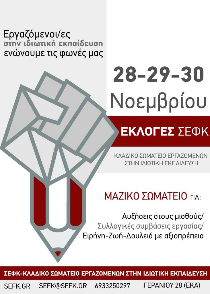 Το τριήμερο 28-29-30 Νοεμβρίου 2025 θα πραγματοποιηθούν οι εκλογές του ΣΕΦΚ – Κλαδικού Σωματείου Εργαζομένων στην Ιδιωτική Εκπαίδευση στα γραφεία του Εργατοϋπαλληλικού Κέντρου Αθήνας (Γερανίου 28 και Πειραιώς).